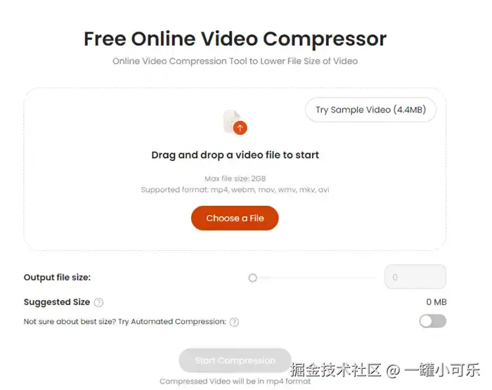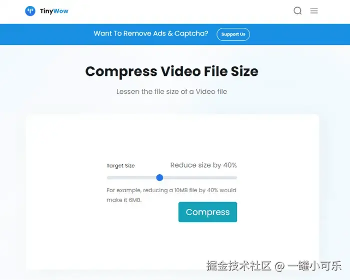Tiny Wow是一款在线视频压缩器,但其涵盖了文件格式的转换、图像处理、视频压缩等多种功能。其视频压缩功能操作简单,用户上传视频文件后,滑动目标大小的参数调节条,调整视频大小,然后点击压缩按钮即可。