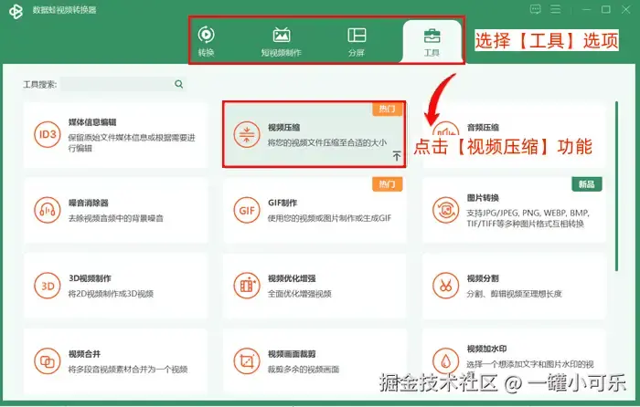 步骤1:打开运行数据 蛙视频格式转换器,选择【工具】选项,点击选择【视频压缩】功能工具。