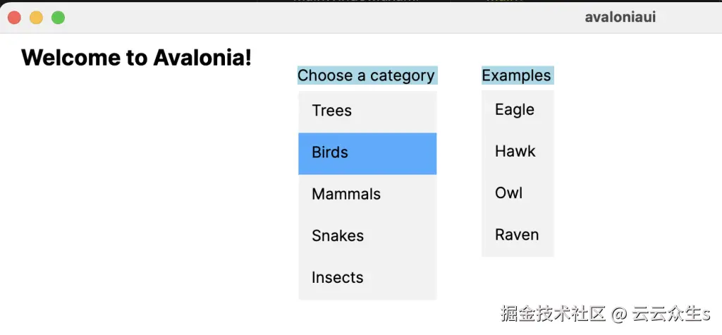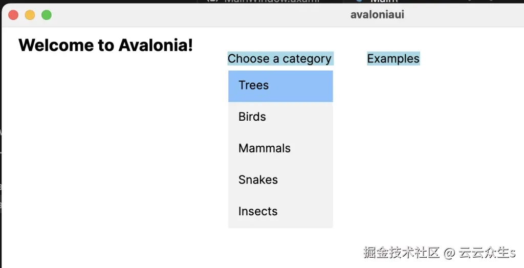 由于 SelectedItem 在我们的例子中是一个字符串,我们可以直接将其用作 category 字典的索引来查找示例。现在我们完成了。我们可以选择任何类别并将结果放入下一个列表框: