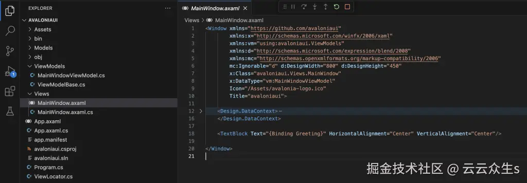 如果你熟悉Windows Presentation Foundation(或 WPF,我乐意假设你对此一无所知),那么你一定见过可扩展应用程序标记语言(XAML),而 Avalonia 使用它自己的品牌“axaml”文件扩展名。你还会注意到它附加了 C# 扩展名来标记“代码隐藏”文件。所有这些都有效,即使有点混乱。是的,它是 XML。