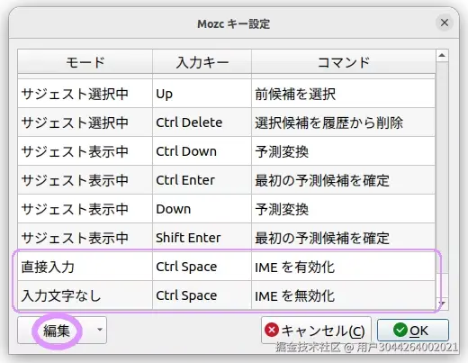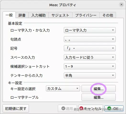 Mozcのツール→プロパティ→一般タブ→キー設定の選択で「編集」をクリック。