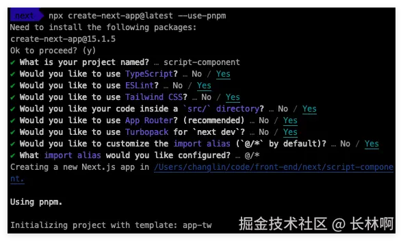 使用命令 npx create-next-app@latest --use-pnpm 创建一个新的项目;具体的项目配置选项如下: