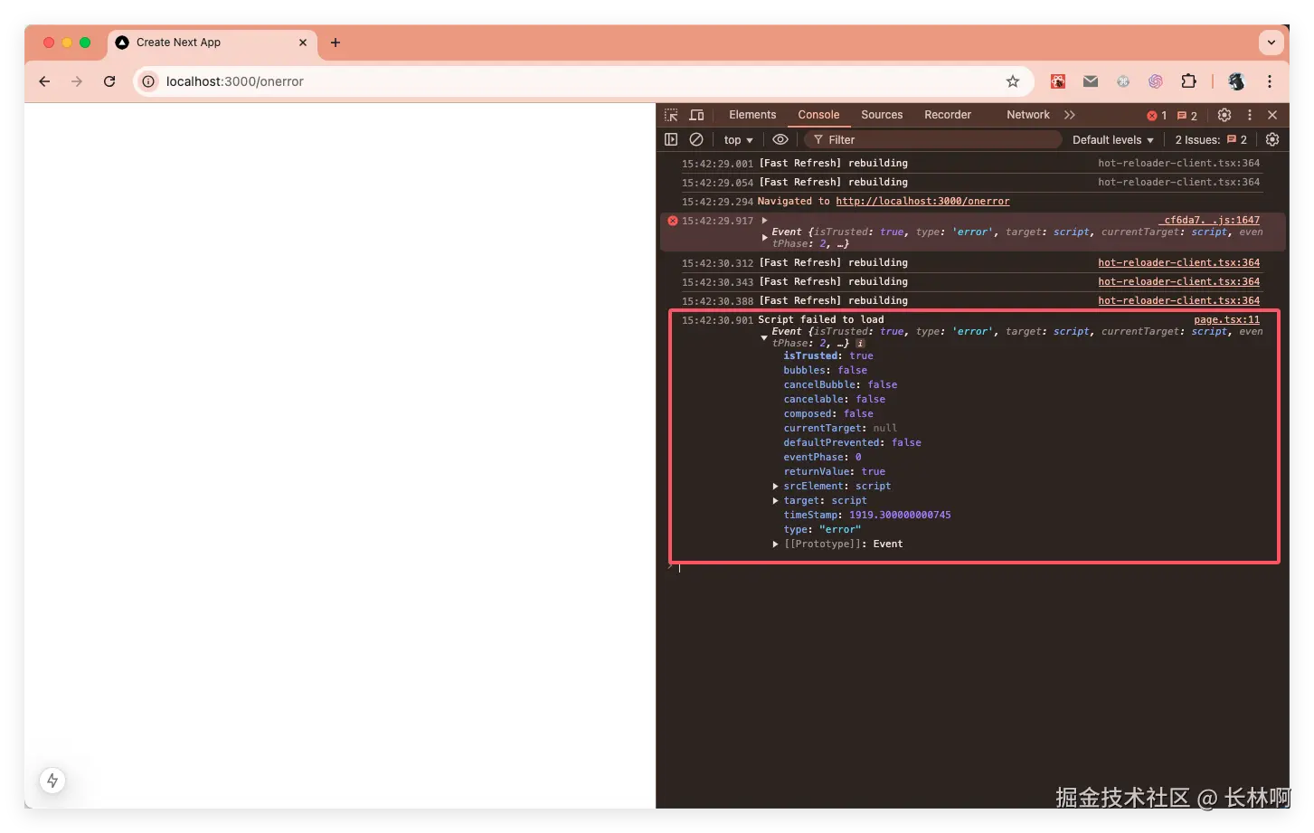 onError 不能在服务端组件中使用,只能在客户端中使用。而且 onError 也不能和 beforeInteractive 一起使用。