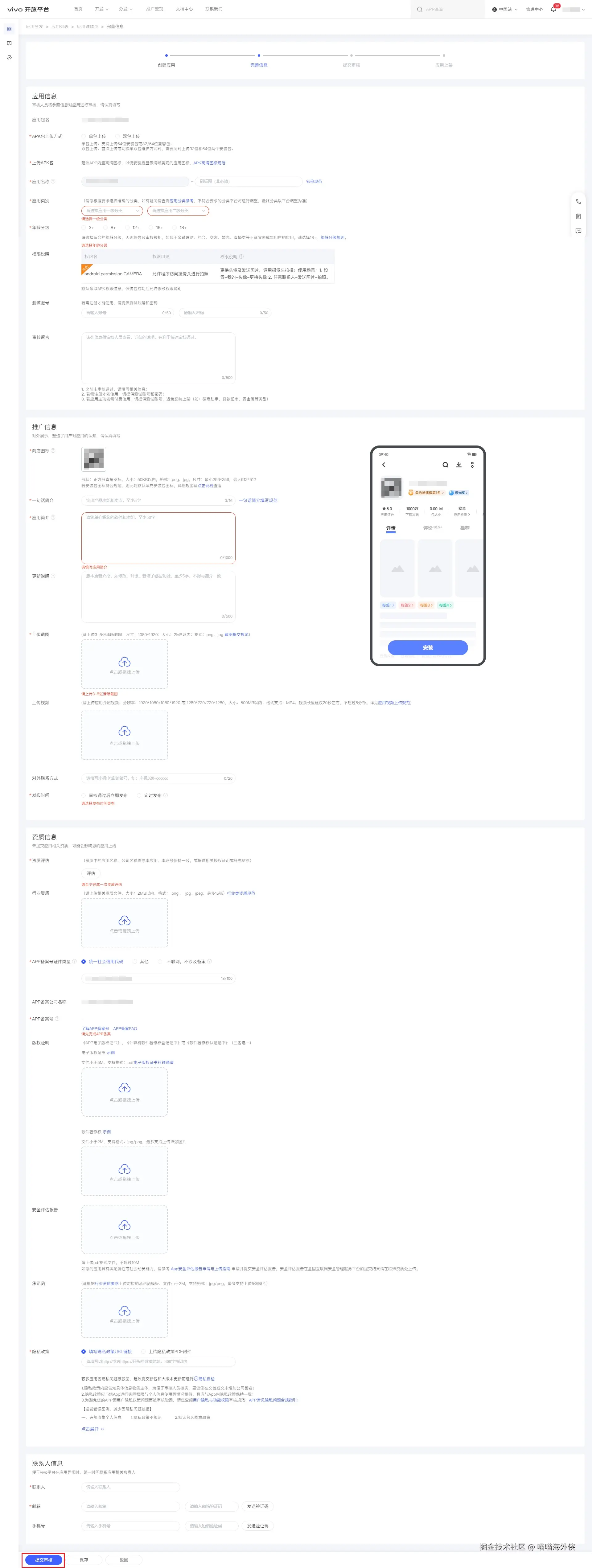 在有信息填写和配置后,可以将应用提交审核。提交前需特别注意以下事项: