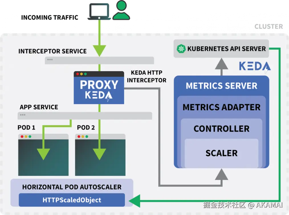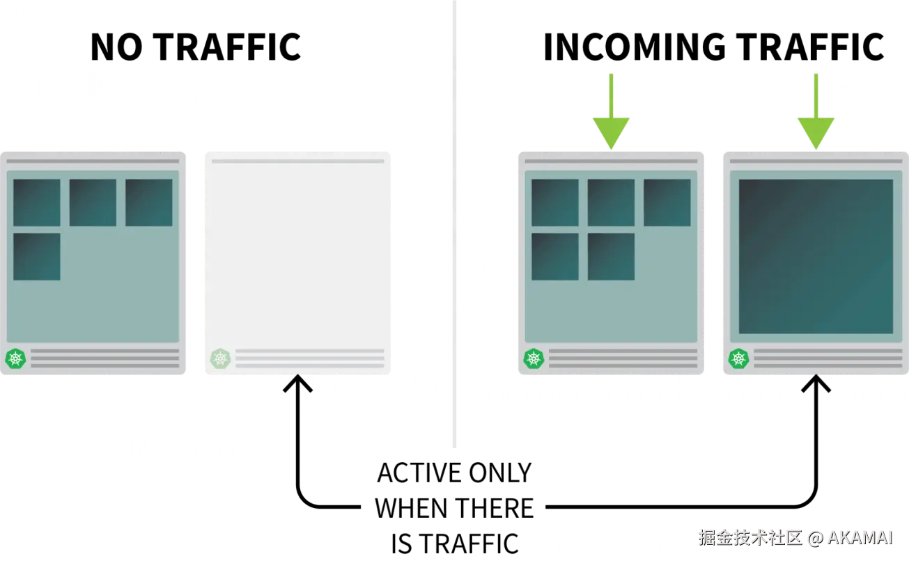 与其编制一个不断增长的规则列表,不如根据流量来扩展我们的工作负载。当流量增加时,可以扩展副本数量;当没有流量时,可以将整个应用关闭。当应用关闭后又收到新的传入请求后,Kubernetes会启动至少一个副本来处理这些流量。