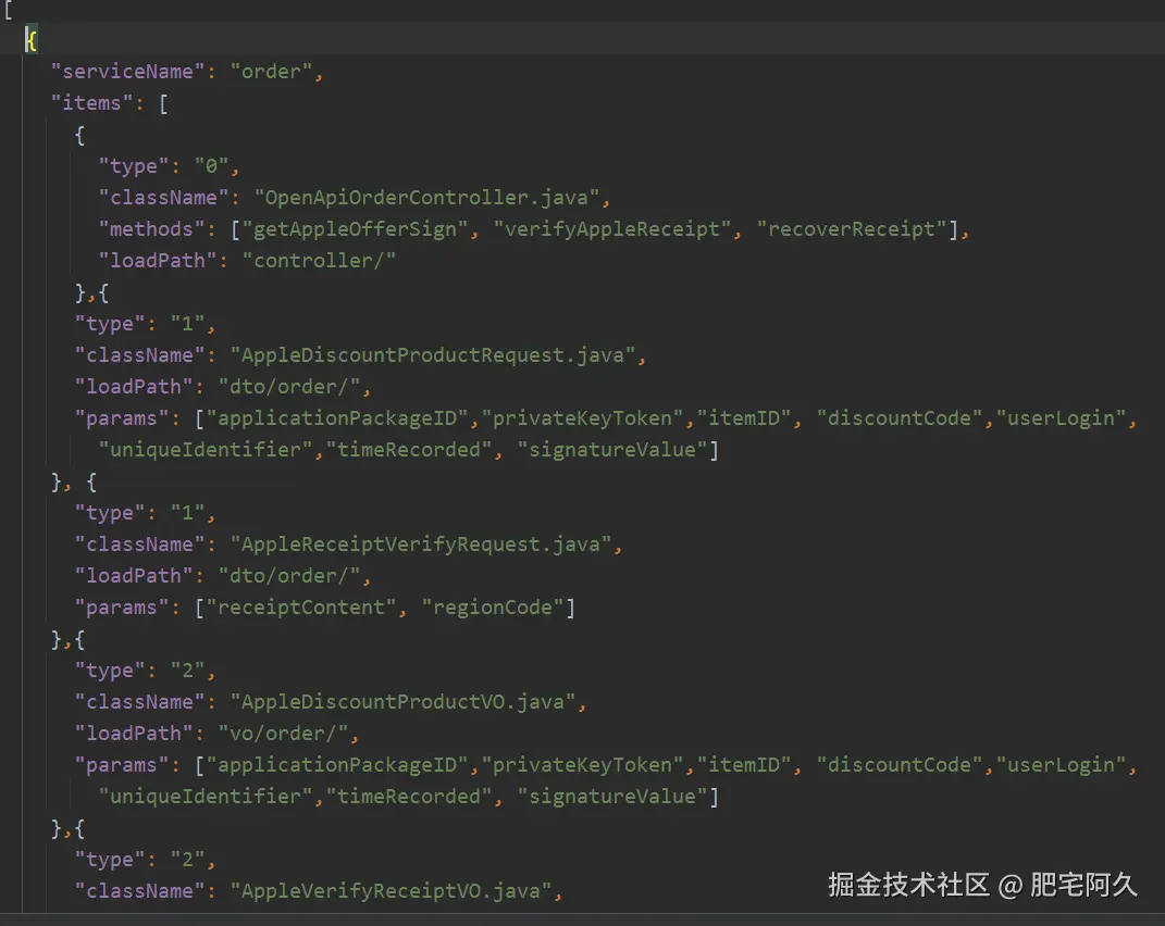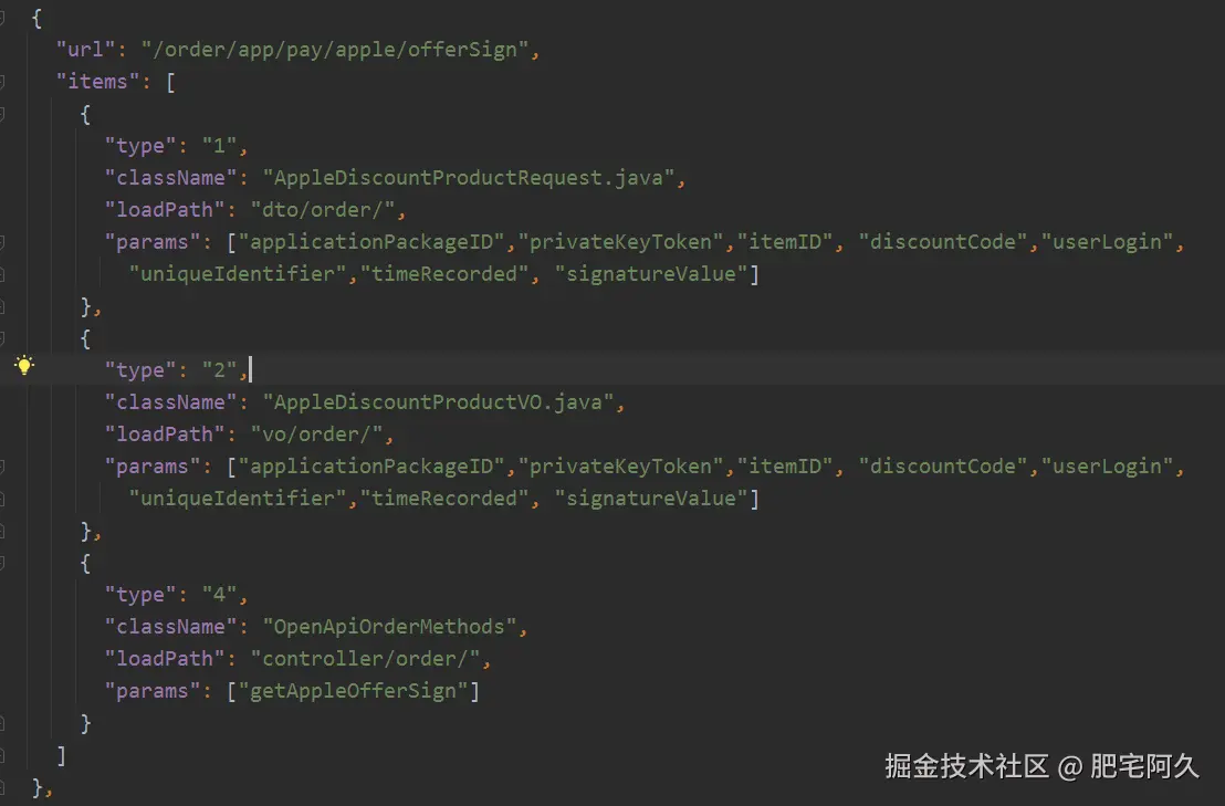 Item 里面的和全量的类似了,唯一区别是 type 没有0,而是增加了一个 type = 4,表示生成的控制器接口方法,这个时候 params 不是表示参数名了,也是表示接口方法名