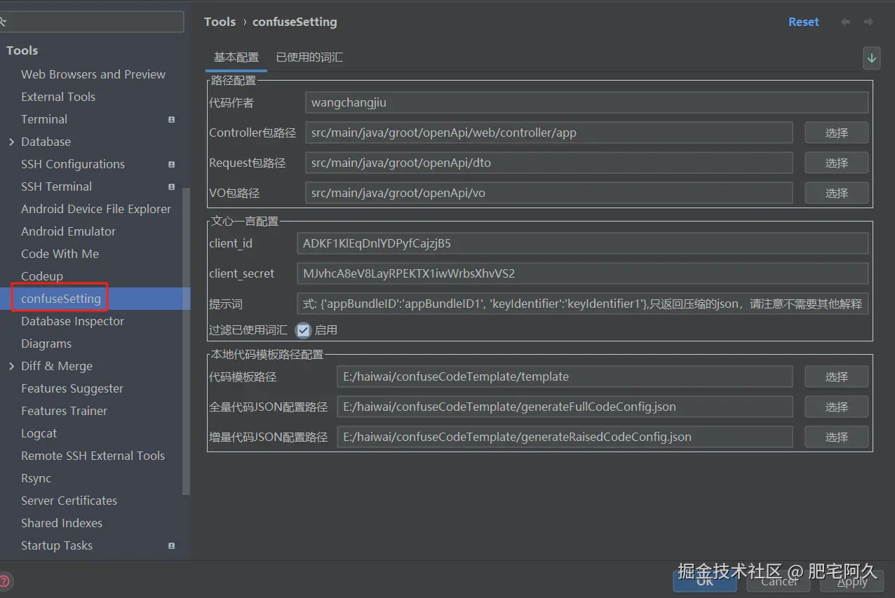 上面配置中,路径配置是生成代码保存的路径。文心一言配置是接入的文心一言大模型配置(主要用户获取参数名称的相近词汇)。本地代码模板配置指生成的代码模板,以及代码模板配置文件,这两种文件不同项目是不同的,但是配置需要按照一定的规则。