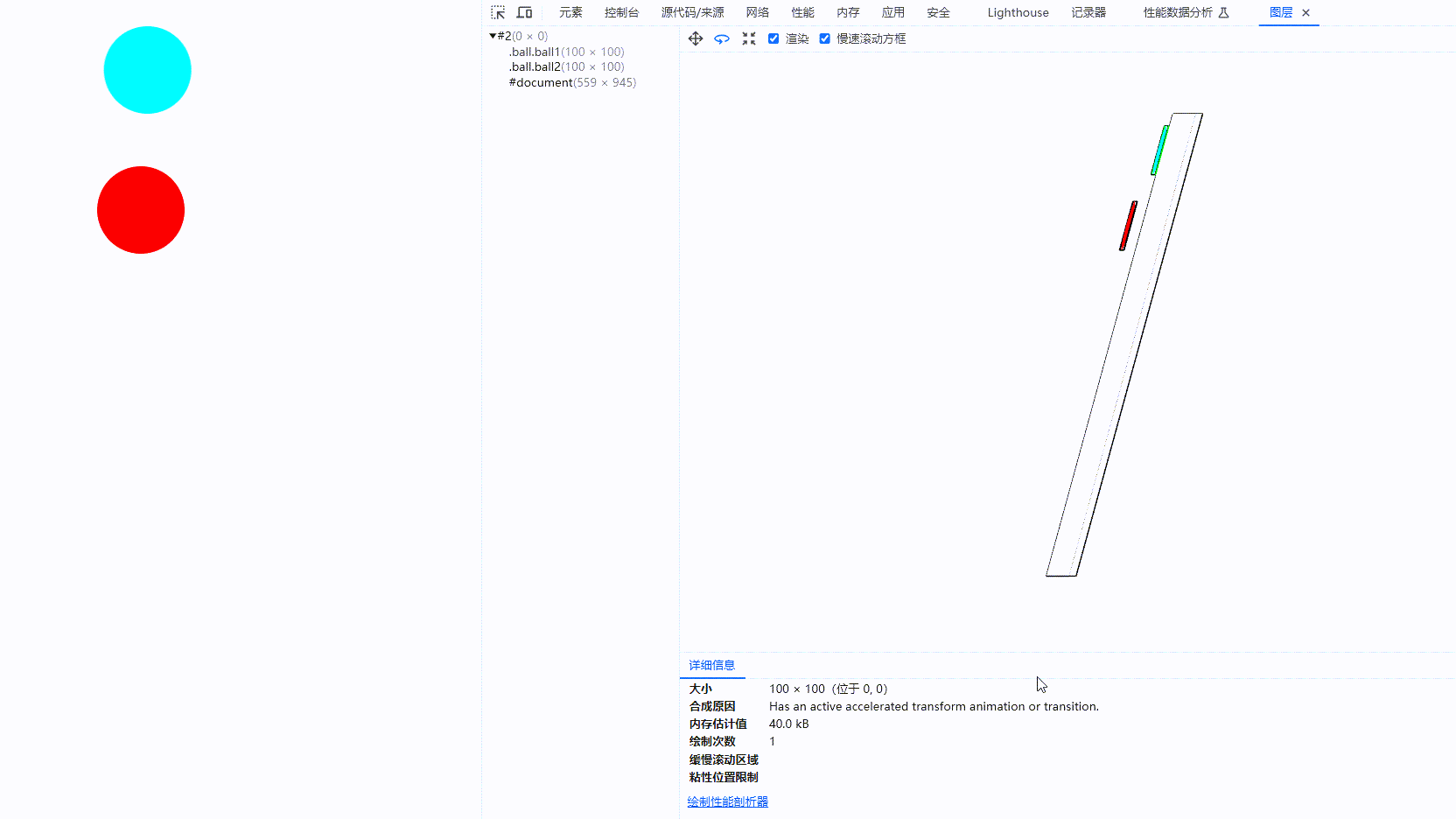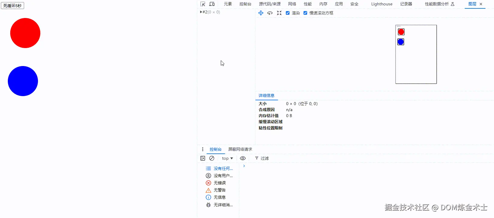 可以发现,使用 left 变化实现动画的蓝色小球,会一直触发重绘;而使用 transform 变换实现动画的红色小球,只会绘制一次。在使用 js 死循环卡死主线程的 5s 时间里,主线程无法完成重绘的操作,造成蓝色小球卡住不动。