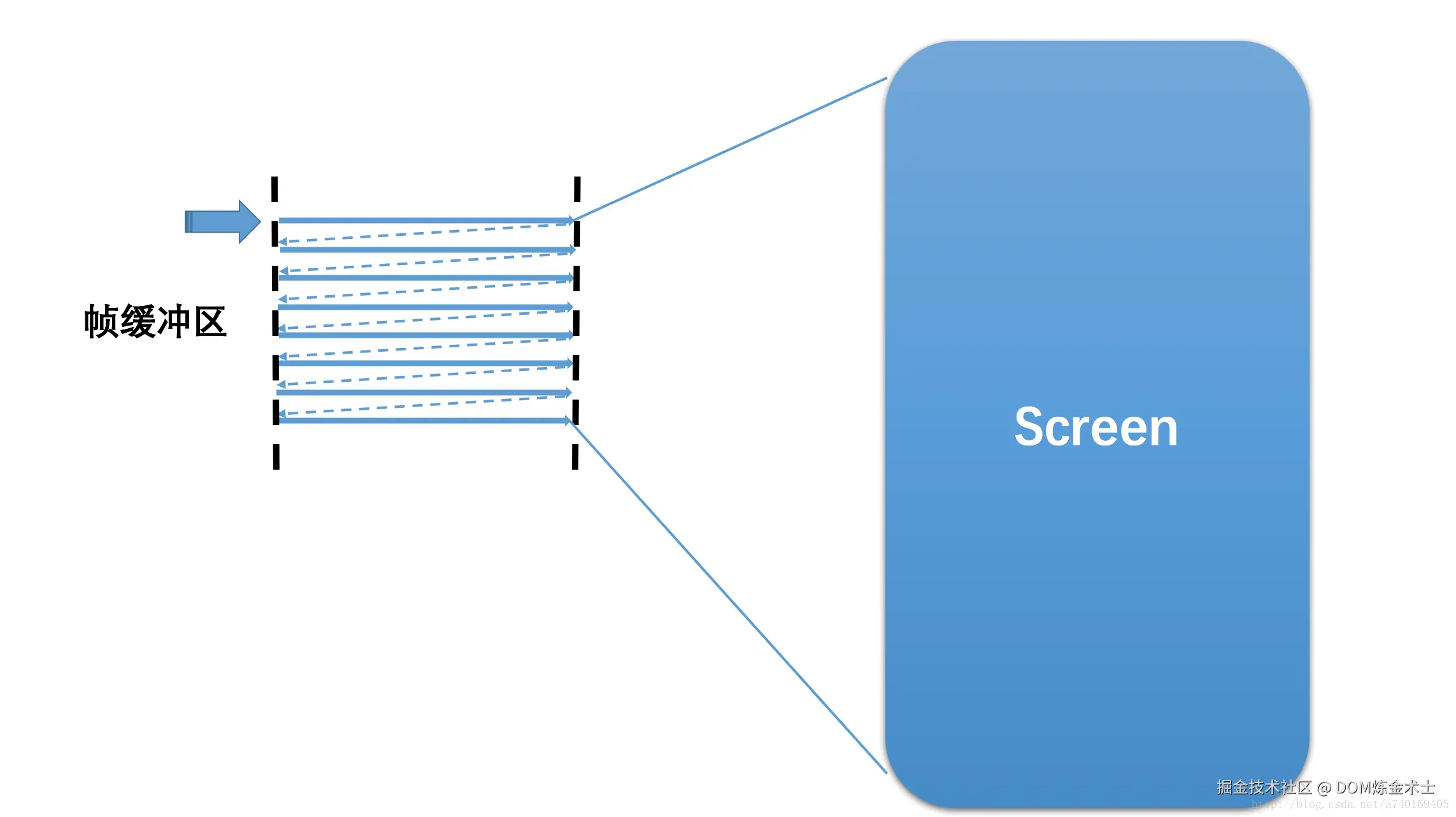 每个显示器都有固定的刷新频率,通常是 60HZ,也就是每秒更新 60 张图片。显示器所做的任务很简单,就是每秒固定读取 60 次缓冲区中的图像,并将读取的图像显示到显示器上。