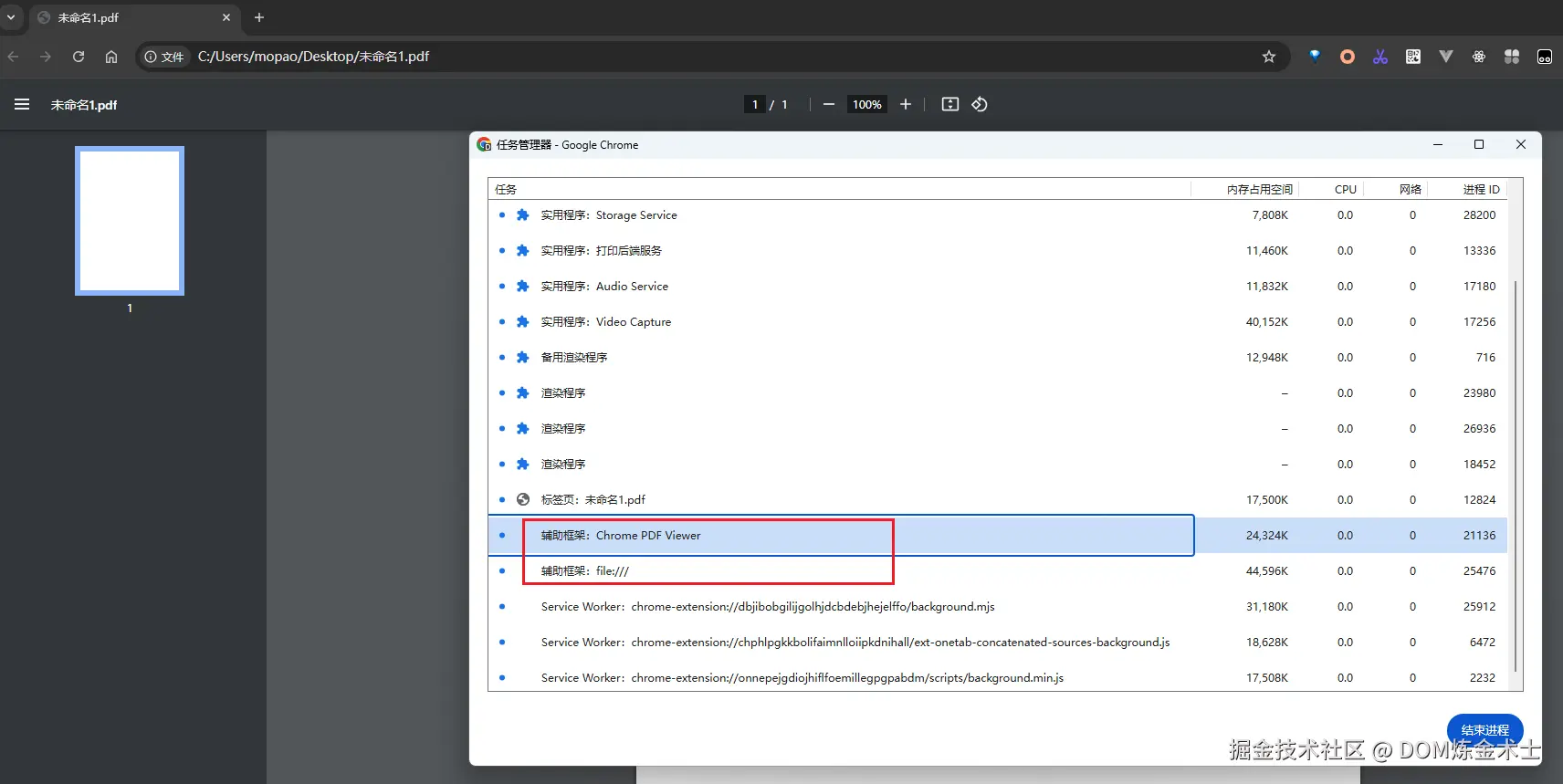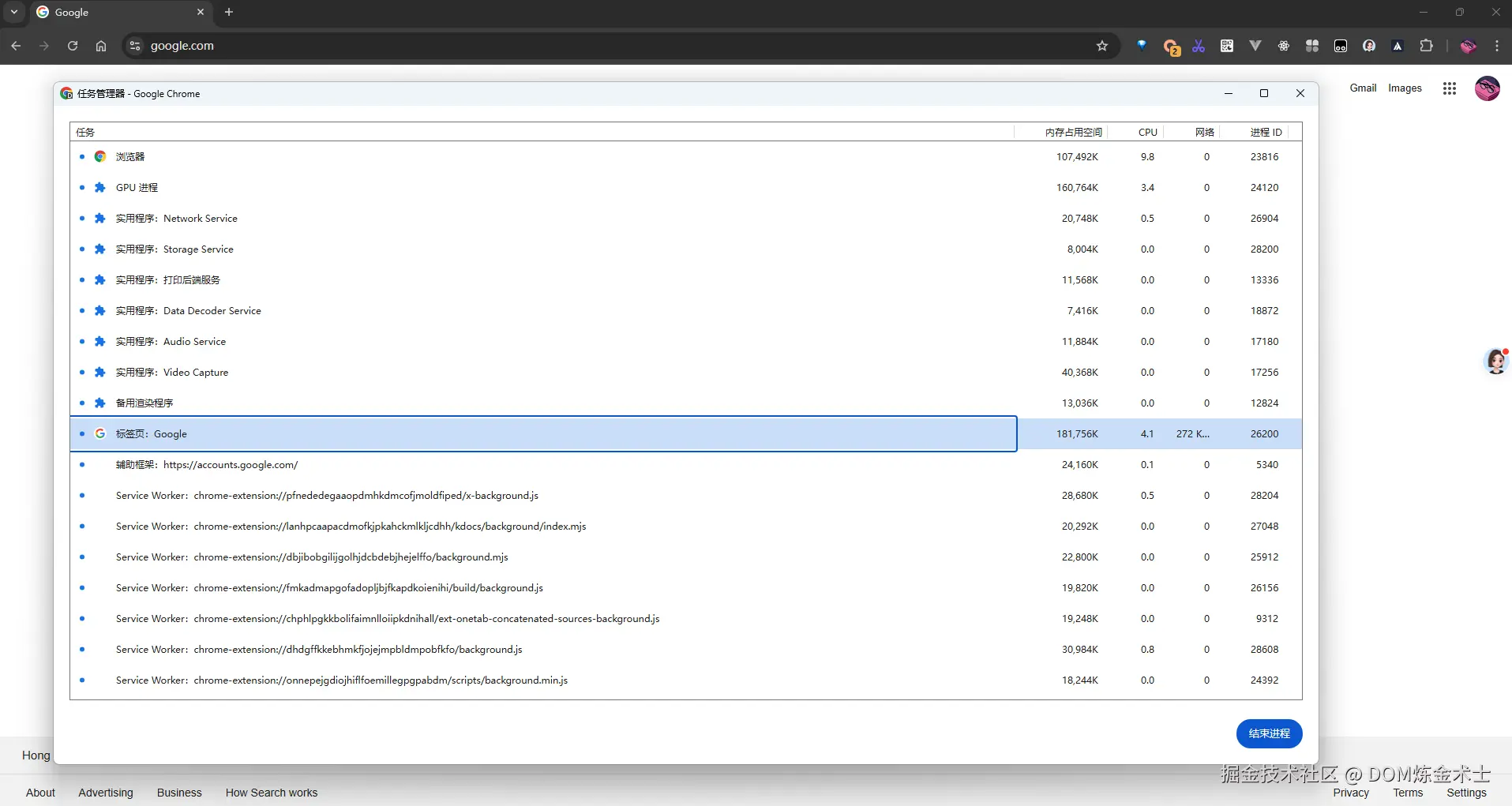 上图中,可以看到 Chrome 任务管理器中显示了多个进程及它们的相关信息,如浏览器主进程、GPU 进程、网络服务(Network Service)、存储服务(Storage Service)、以及 Service Workers 等等。下面将详细介绍这些进程和服务。