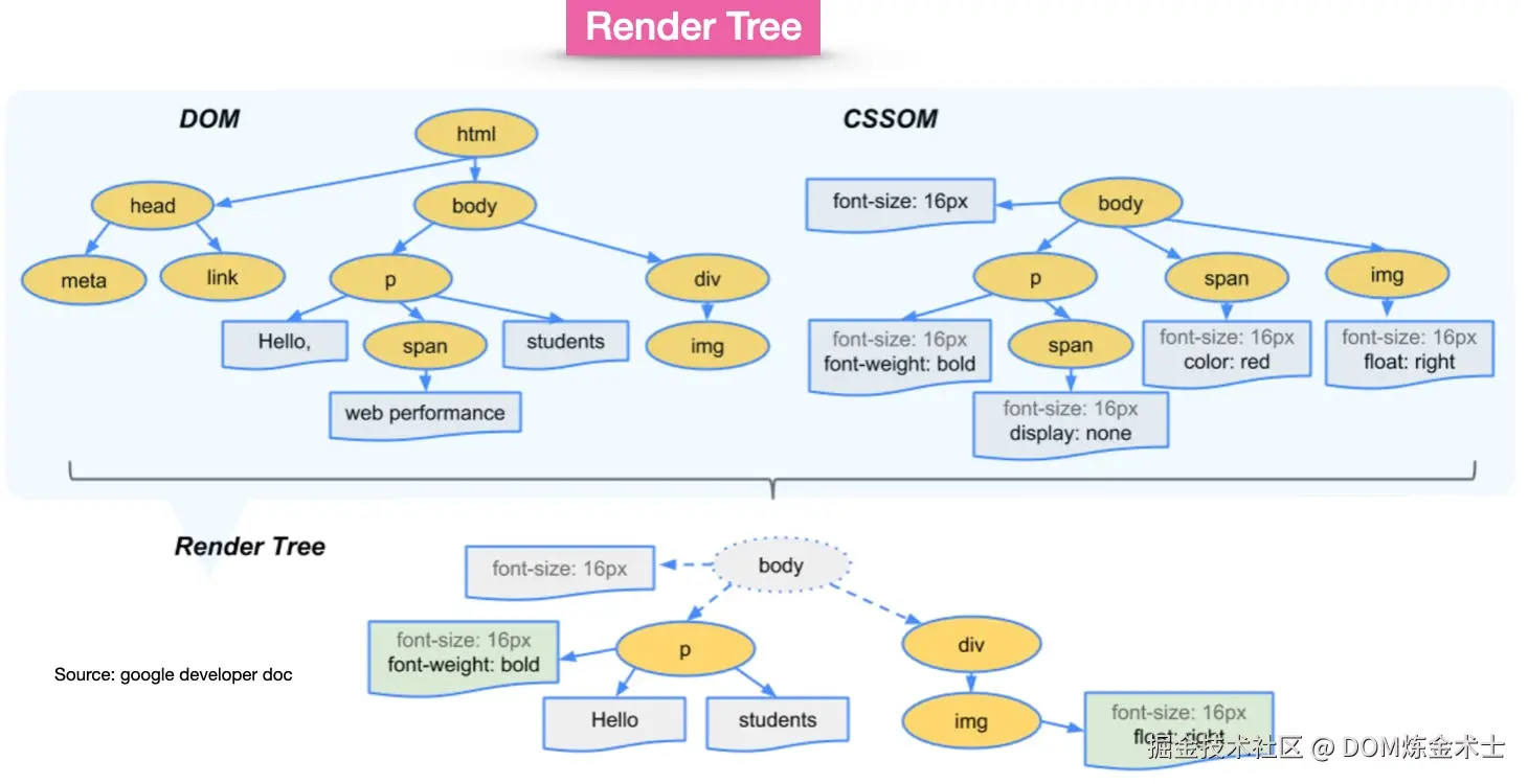 - 构建渲染树(Render Tree):根据 DOM 树和 CSSOM 树,生成渲染树。