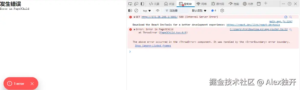 在事件处理程序中引发的异常将向上传播,直到被ErrorBoundary捕获。在这里,我们将Page4组件包裹在App组件的ErrorBoundary中。