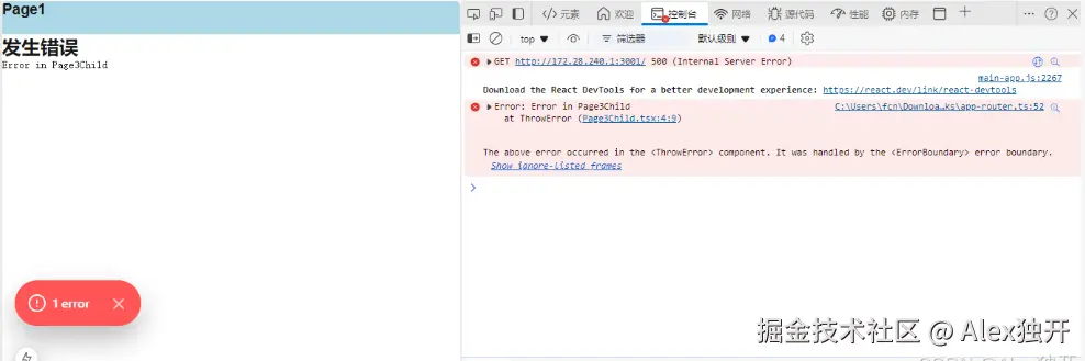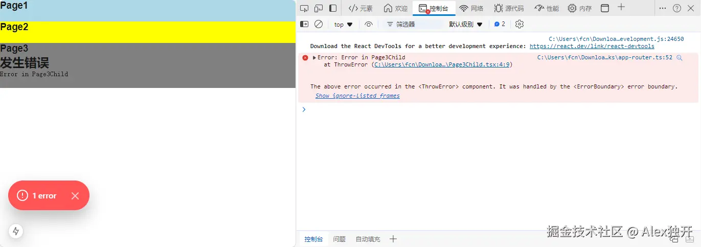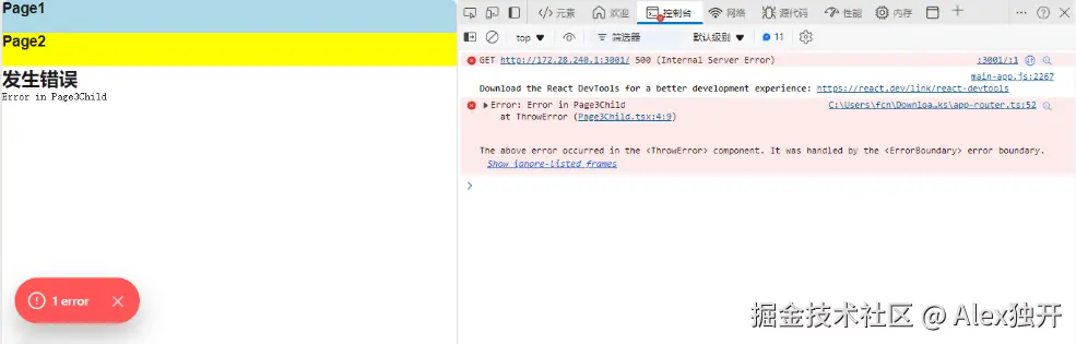 此时,当Page3Child组件引发错误时,ErrorBoundary将捕获该错误并显示ErrorFallback中显示错误信息的组件。