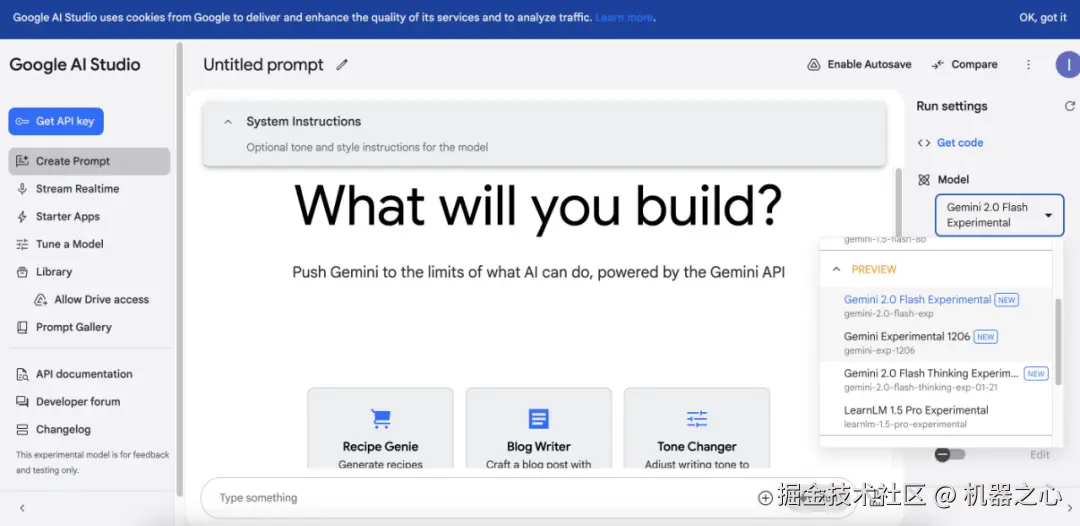 进入 Gemini 2.0 Flash Thinking 的互动界面,可以发现谷歌把 Gemini 系列所有模型都放在了这个称为「Google AI Studio」的界面。