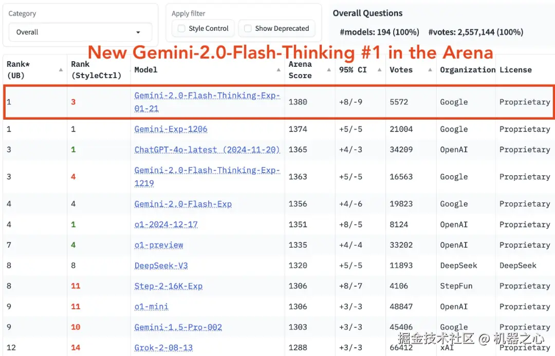 就在今天,谷歌发布了 Gemini 2.0 Flash Thinking 推理模型的加强版,并再次登顶 Chatbot Arena 排行榜。