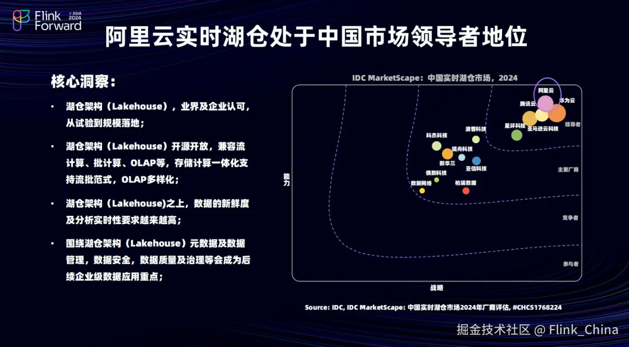 第二个重要的结论是,阿里云目前处于领导者象限的首位。这意味着,如果企业希望应用或深入了解实时湖仓,阿里云提供的方案相对成熟,并且具有深厚的技术积累和实践经验。