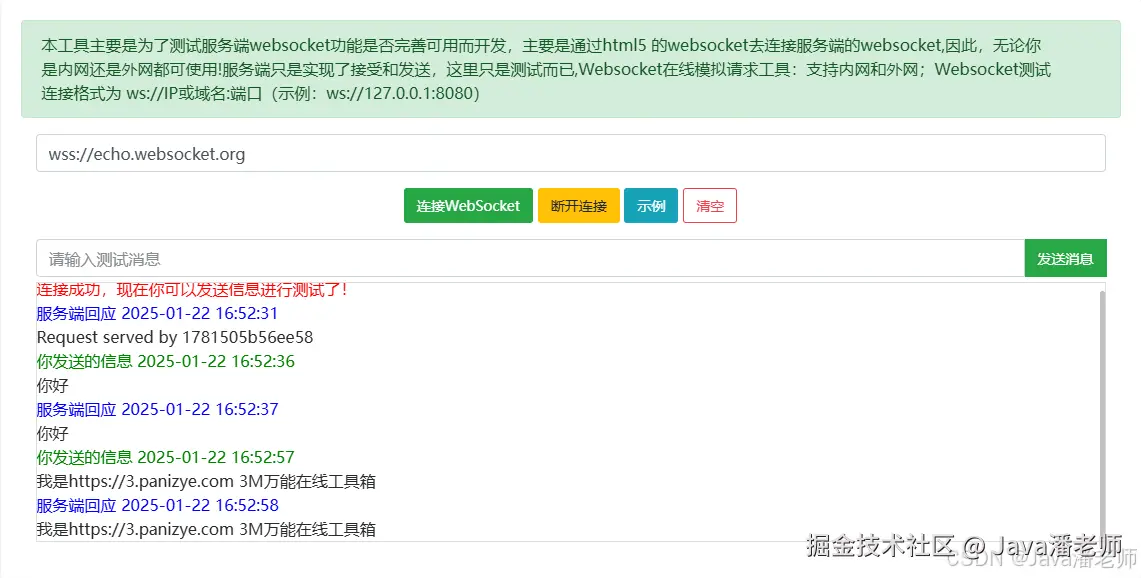 3M万能在线工具箱提供了一个简单易用且功能强大的WebSocket在线测试工具,是开发者和测试人员的理想选择。 点击以下链接即可直达:WebSocket在线测试工具。