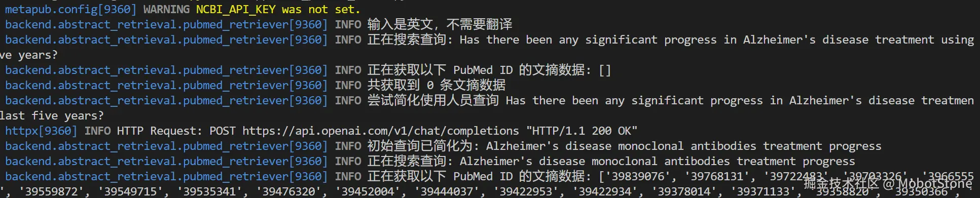 从输出日志中,您可以看到,在没有简化的情况下,未检索到任何文献摘要,而在简化查询后,检索到 243 篇文献摘要。