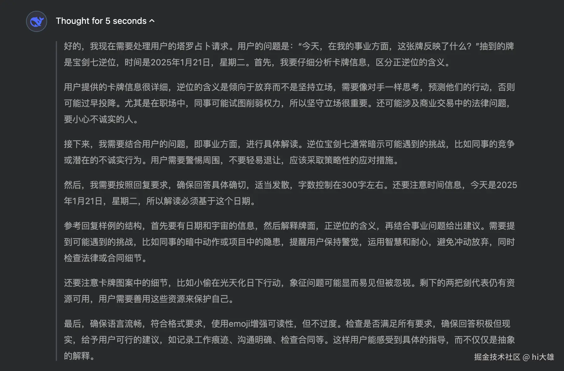 比较有趣的一个点是,deepseek R1 把它 Think 的过程,全部显示出来了,这样可以很清晰地知道 LLM 使用了哪些Prompt 的指令,对于后续优化和迭代输出效果,以及调整Prompt 的工作流 都有很大的帮助。