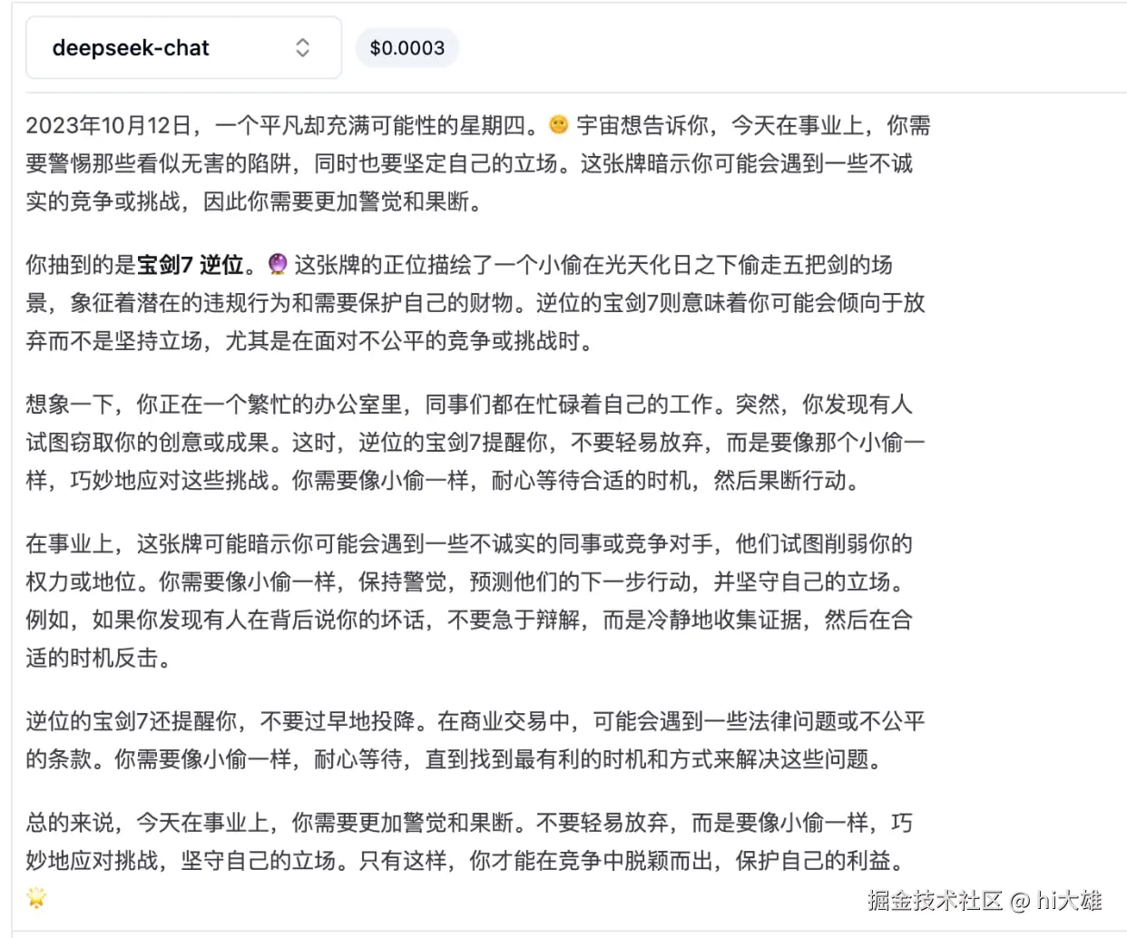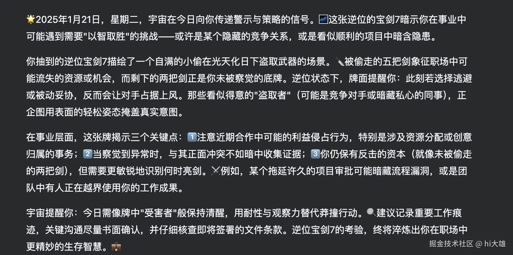 举例来说:点击爱情 Tag ,那么会使用问题【今天,在我的爱情方面,这张牌反映了什么?】会作为输入,输出占卜的解读结果。下面是期望的回复效果: