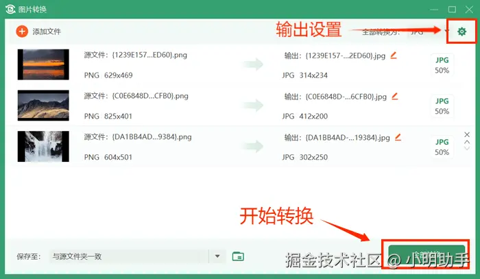 第四步:如果有需要的话,可以点击右上角的绿色齿轮图标进行图片质量、缩放比例等输出设置。确认所有操作完成无误后,点击右下角的【全部转换】按钮开始转换视频格式。