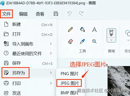 第三步:点击【文件】按钮,将鼠标移动到【另存为】上,选择【JPEG图片】(即JPG图片)。