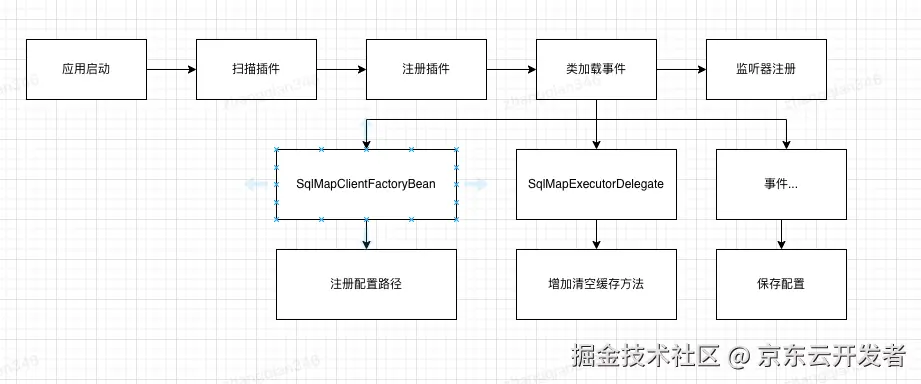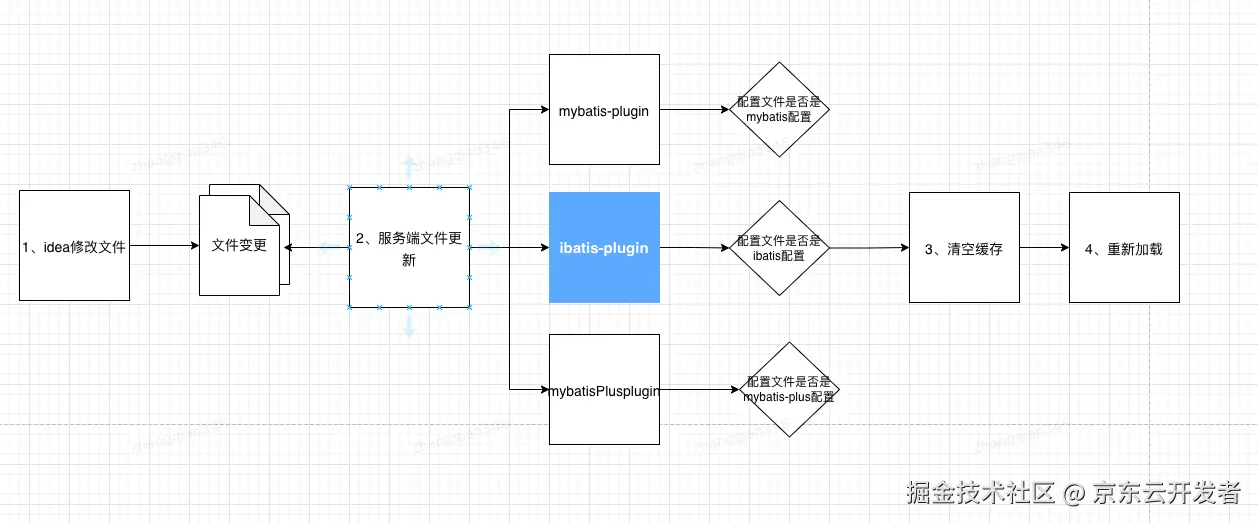 下面的@Plugin注解信息,然后注册插件信息,其中就包含springPlugin、ibatisPlugin等插件,插件的方法上会通过@OnResourceFileEvent注解方式,在资源变更后反射调用该方法。进而更新不同的文件信息缓存,同时会根据不同的类触发事件,写入不同的缓存信息,根据事件@OnClassLoadEvent(classNameRegexp = "com.ibatis.sqlmap.engine.builder.xml.SqlMapConfigParser") 写入sqlMapConfig配置信息,根据事件SqlMapClientFactoryBean注册配置文件内容,根据事件“SqlMapExecutorDelegate”添加清空缓存方法clearMapperState