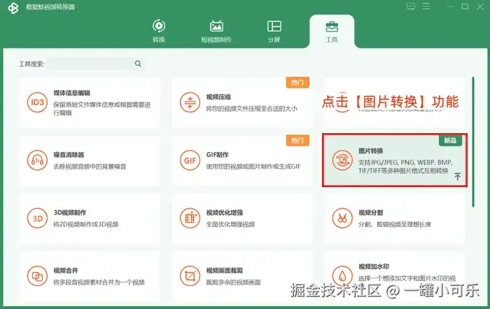 步骤1:打开数据 蛙视频转换器并进入工具选项的页面,然后找到并点击【图片转换】功能。
