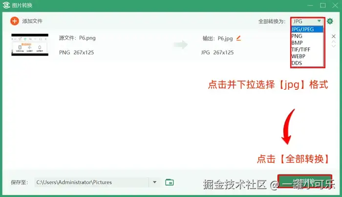 步骤3:单击格式选择框,点击并下拉选择【jpg】格式,然后点击【全部转换】。