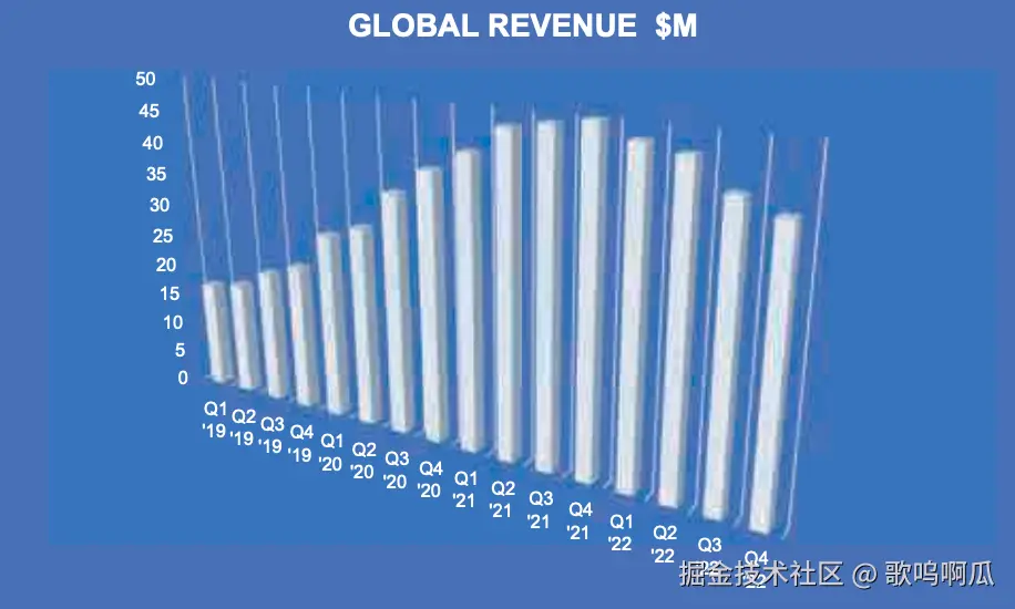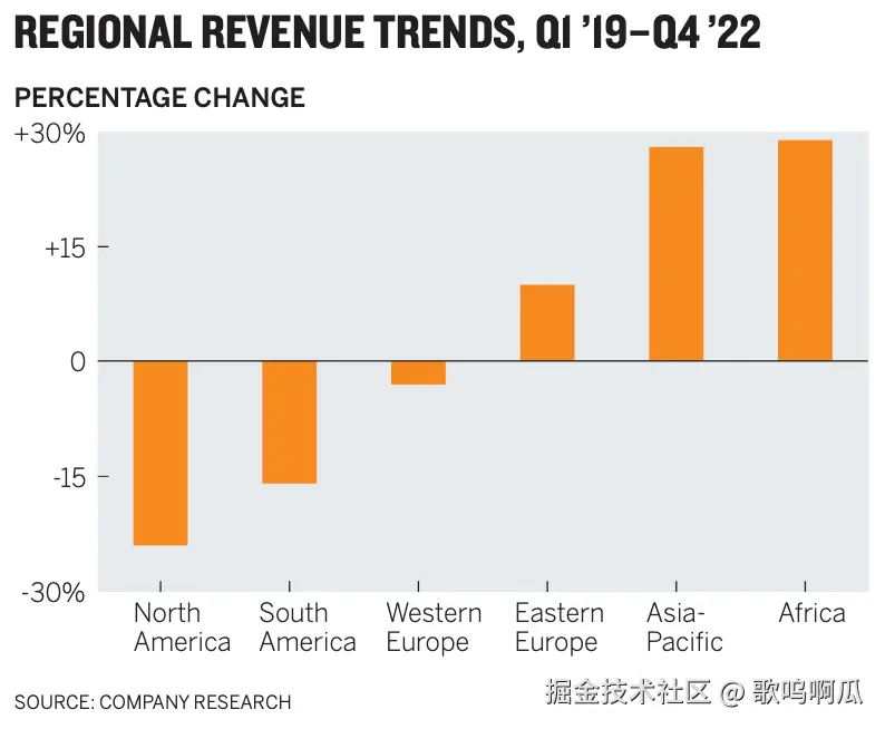 图表一与图表二之间所呈现的内容存在一定的差异。图表一是我们所常见的柱状图,颜色简单,内容直白。不同地区之间的数据变化百分比通过零值线上下柱子的延伸而清晰的表现了出来。图表二使用了更容易抓住阅读者实现的三维形式。从俯视的角度观察不同季度的数据增长,数据之间的高低比例由于透视关系而表现的更为醒目。