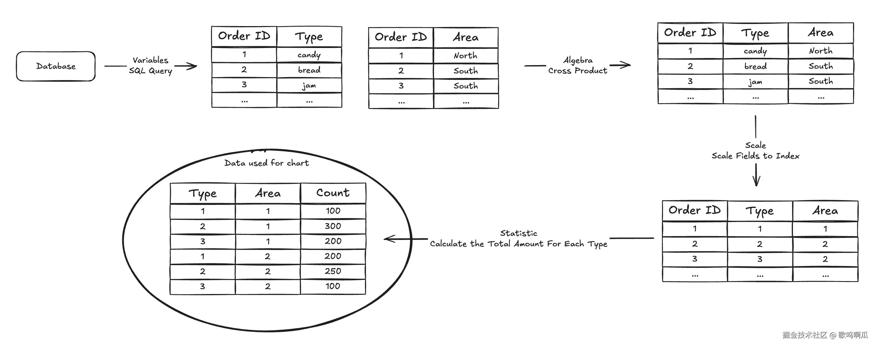 举例而言,数据库中存储了每一个订单的交易信息。首先 Variables 阶段通过 SQL 查询获取订单的类型以及区域信息。Algebra 阶段可以将两个字段的信息进行叉乘整合成一个新的数据表,从而在一个图表中展示多个字段的信息。Scale 阶段将离散的字段信息映射到整数形式的编号。最后,为了减少数据量,Statistics 阶段可以统计表格中相同 Type 以及 Area 的数量,并生成一个新的 Count 字段。