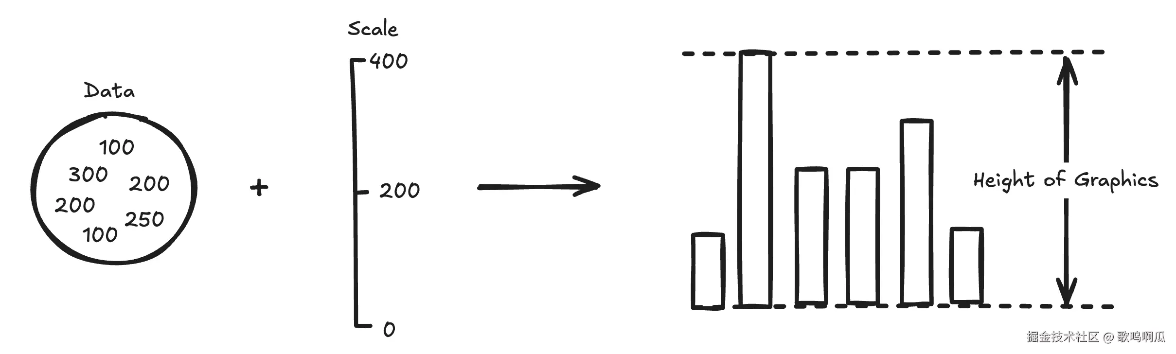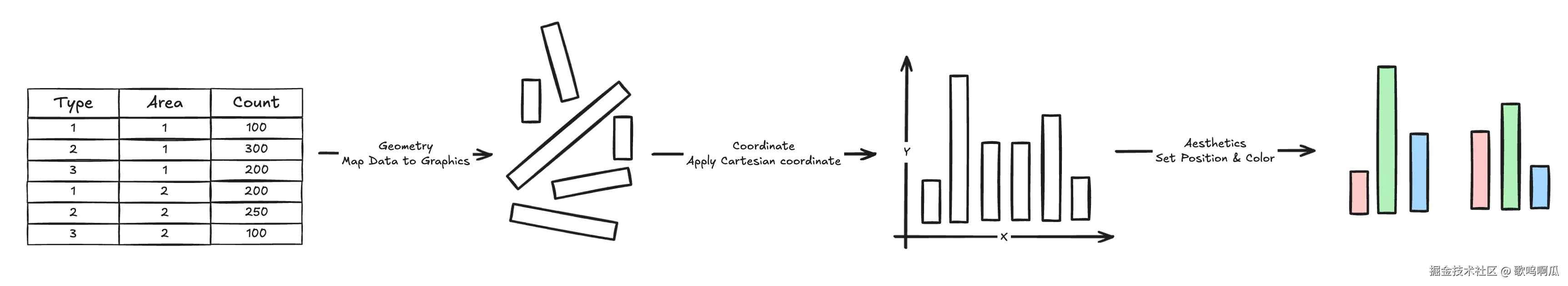 你是否思考过一份数据是如何转换为图表的呢?是的,我们有柱状图、折线图、面积图、饼图,我们在 excel 里头框选某个范围的数据,点击嵌入就能生成一张图表。但是这些图表上的不同部件,不同元素,是如何从原始的数据一步步转换为最终的视觉呈现的呢?