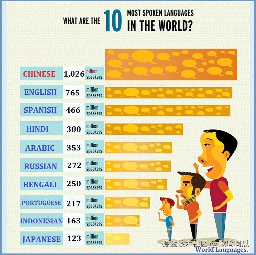 图表对比了不同语言的使用者数量,在除了 Chinese 以外的语言中,图表通过常规的条形图来对比不同语言的人数差异,数据中语言对应的使用者数量映射到了 interval 图形的宽度。