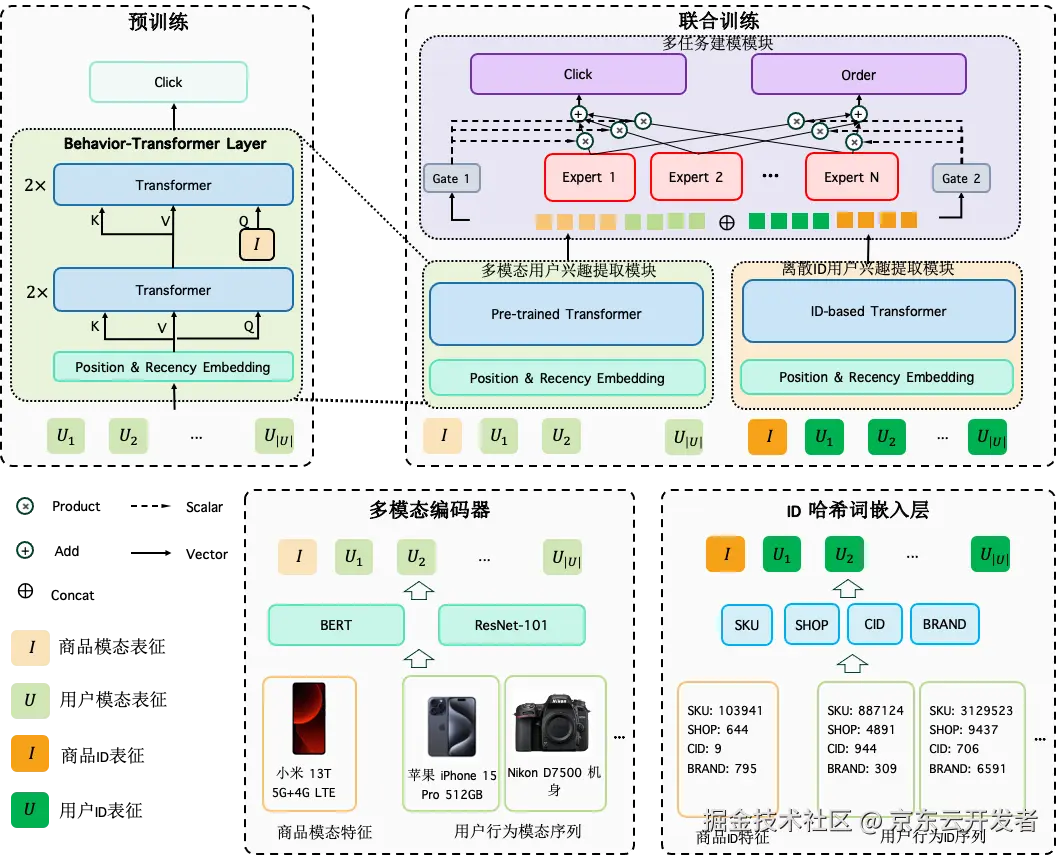 目前精排模型是ID-based 范式(IDRec),即基于各种 ID 特征,如sku id, shop id, brand id等,建模用户历史行为序列和待排商品间的关系。ID-Rec 模型虽然已取得了不错的效果,但缺乏泛化能力。因为ID-based模型中,各个ID表示的准确性与ID在训练样本中出现的频率高度相关,这导致精排模型对中长尾商品的排序能力不足。我们摒弃了传统的在特征层面融合ID和模态特征的方式,而是在模型层进行了融合。网络分为两部分,MoRec 和 Unified Ranking Model(URM)。MoRec利用文本和图像的表征,采用预训练的方式以CTR为监督信号进行训练,URM将预训练好的MoRec和IDRec进行端到端的训练。