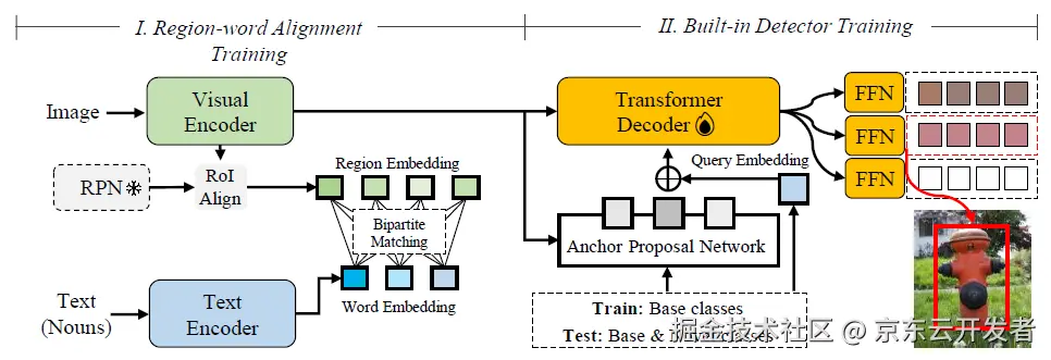 开放词汇目标检测旨在检测与训练过程中使用的基类独立的新类别。大多数现代方法遵循从大规模多模态语料库中学习视觉-语言空间,然后将所学知识迁移到现成的检测器(如Faster-RCNN)的范式。然而,由于数据集域的差距,在知识迁移过程中可能会发生信息衰减或破坏,从而阻碍对新类别的泛化能力。为了缓解这一困境,在本文中,我们提出了一种名为BIND(内置检测器)的新框架,以消除模块替换或向现成检测器进行知识迁移的需求。具体而言,我们设计了一个具有编码器-解码器结构的两阶段训练框架。在第一阶段,训练一个图像-文本双编码器,以从图像-文本对语料库中学习图像区域-词语的细粒度对齐。在第二阶段,训练一个DETR风格的解码器,以在有标注的目标检测数据集上进行检测。传统手动设计的非自适应建议框生成范式容易引入大量冗余框,这里我们开发了一个锚点提议网络,该网络基于候选自适应地生成具有高可能性的锚点提议,从而显著提高了检测效率。