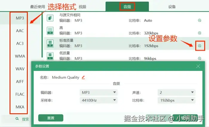 第三步:进入输出格式选择界面之后,点击该界面的【音频】按钮,在左侧的输出格式选择格式栏里面选择自己所需要的音频格式。有需要的话,可以点击右侧齿轮图标进行相关参数的设置。