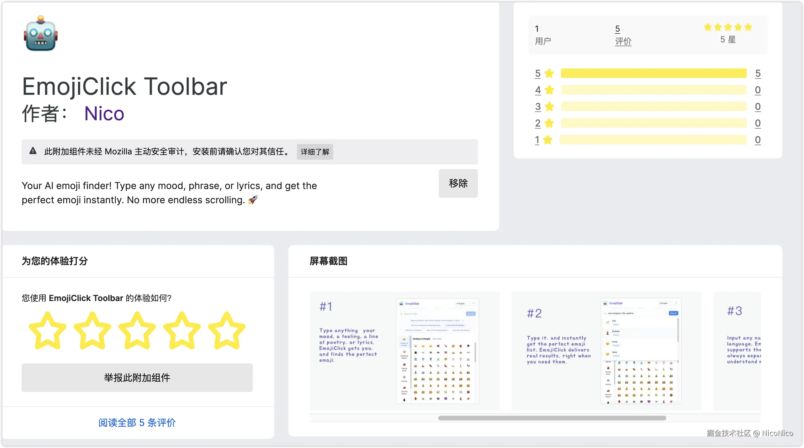 这些信息的填写,建议还是要多花点时间和精力,当然如果你已经提交过 chrome 市场了,完全可以复制之前的内容。但是,我在此处就踩坑了,Firefox 产品详情页在渲染图片的时候,并不如 chrome的那么自然,具体效果可以看这个链接:addons.mozilla.org/zh-CN/firef…