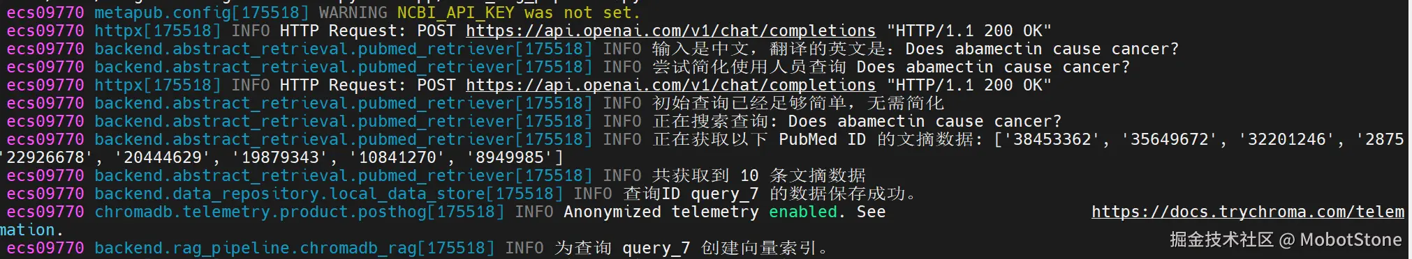 PubMedAbstractRetriever的get_abstract_data方法来检索文摘,使用LocalJSONStore将文摘保存到本地文件系统,接着使用ChromaDbRag创建向量索引。最后,在代码的最后一行,使用原始用户查询对该索引进行相似度搜索。 - 输出日志如下所示: