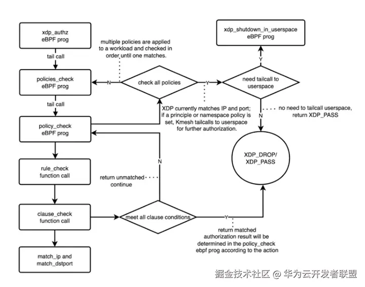 在 Kmesh v0.5.0 版本 中,Kmesh 已经将 authorization 的部分功能下沉到 XDP 程序中执行。在 v1.0.0 版本我们将更多的 authorization 能力下沉到 XDP 中,现已经支持基于IP的 authorization 处理。整体的处理流程图如下图所示:
