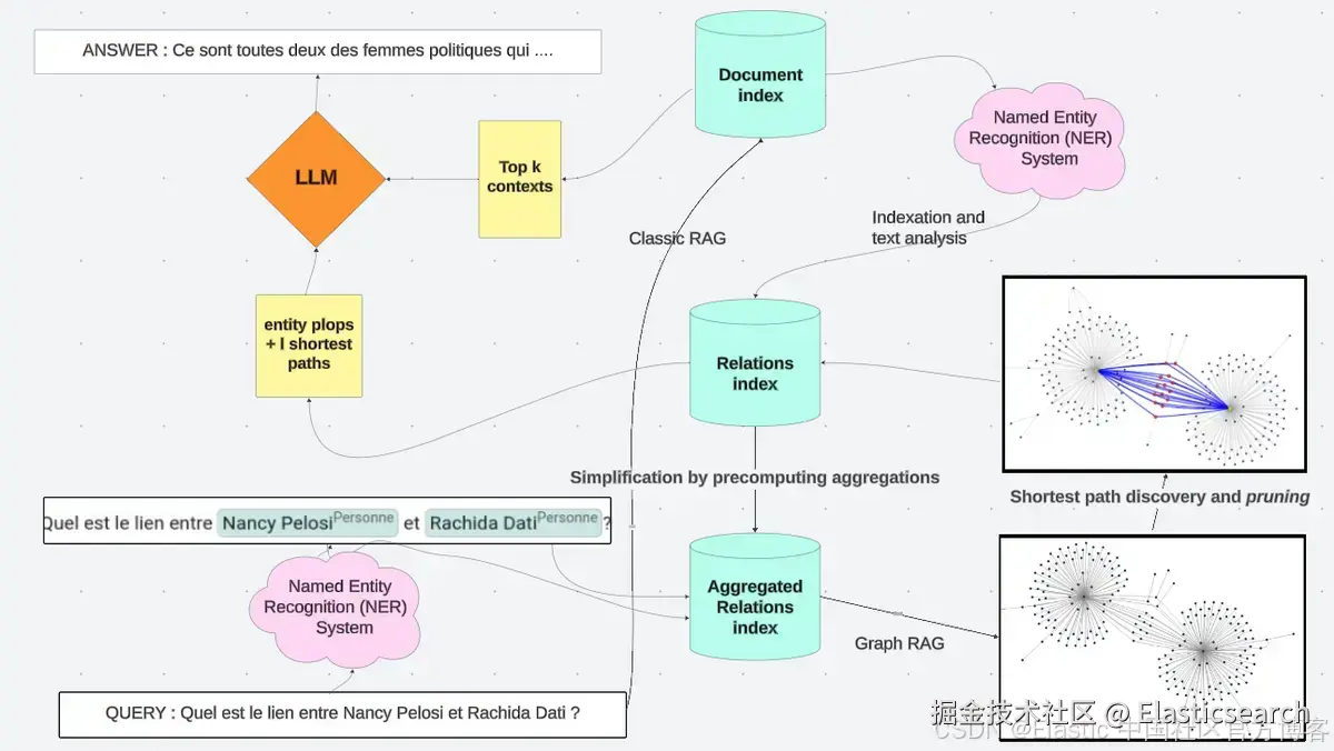 假设我们想在一个专注于法国外交政治的大型数据库中找出 Nancy Pelosi 和 Rachida Dati(法国最无礼的政治家之一)之间的关系。经典 RAG 无法找到相关联系,因为这两个实体没有出现在数据库中的同一篇文档中。我们能在图中恢复这两个女人之间的联系吗?这实际上可以通过四个步骤实现: