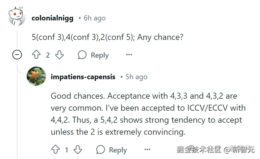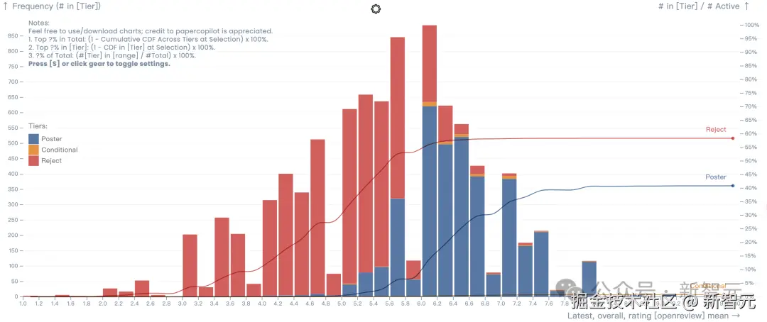 根据「Paper Copilot」的统计,评审均分在 6.0 以上被接受的可能性较大,均分在 5.0 以下几乎不会被接受。