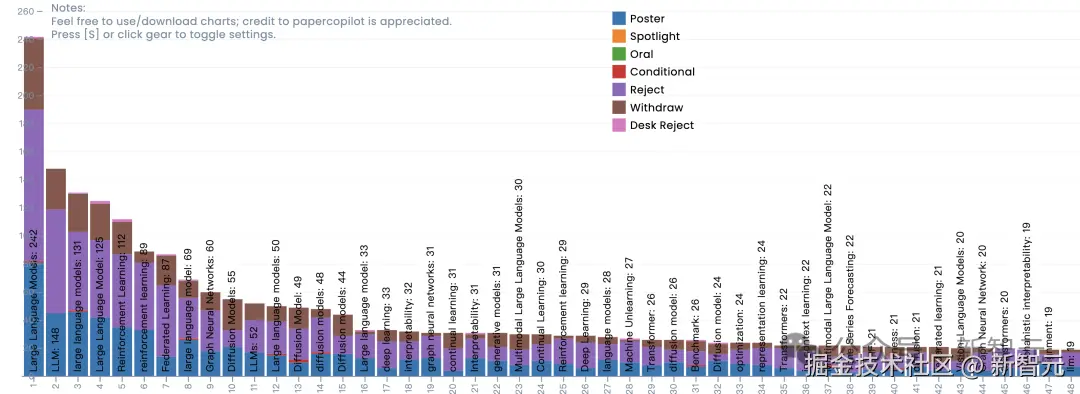 此外,强化学习主题在前 10 中,也占有两位。前 10 关键词中还包括联邦学习、图神经网络和扩展模型。