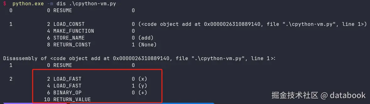 命令行中使用:python.exe -m dis .\cpython-vm.py查看字节码。