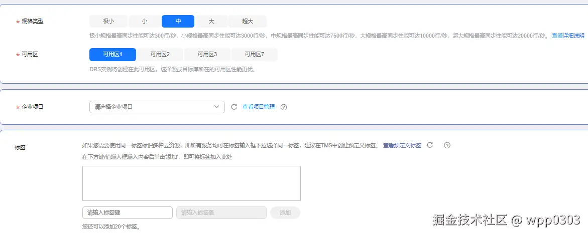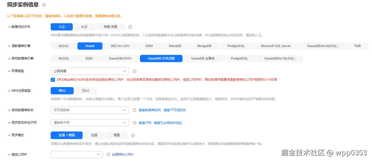 配置同步实例信息,选择“数据流动方向”、“源数据库引擎”、“目标数据库引擎”、“网络类型”、“DRS任务类型”、“目标数据库实例”、“同步实例所在子网”、“同步模式”、“指定公网IP”(网络类型选择公网网络时需要配置该参数)、“规格类型”、“可用区”和“企业项目”,选填“标签”。