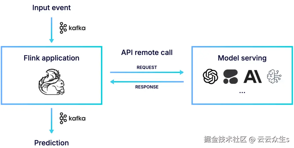 Flink使开发人员能够通过远程推理将实时数据流连接到外部机器学习模型,其中模型托管在专用模型服务器上并通过API访问。这种方法非常适合集中模型操作,允许简化更新、版本控制和监控,而Flink则处理实时数据流、预处理、数据管理和后处理验证。
