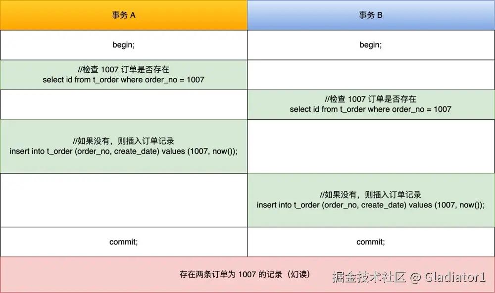t_order 表中的 order_no 字段为唯一二级索引,并且已经存在 order_no 值为 1001 的记录,此时事务 A,插入了 order_no 为 1001 的记录,就出现了报错。