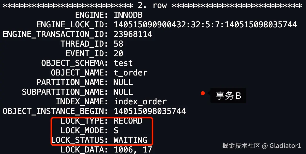 我们也可以从 performance_schema.data_locks 这个表中看到,事务 B 的状态(LOCK_STATUS)是等待状态,加锁的类型 X 型的记录锁(LOCK_MODE: X,REC_NOT_GAP )。