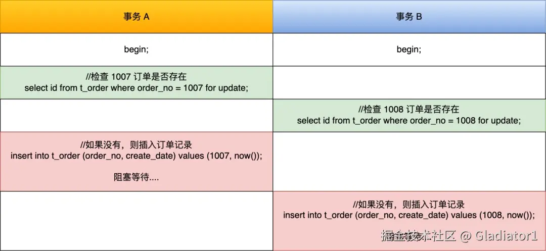 案例中的事务 A 和事务 B 在执行完后 select ... for update 语句后都持有范围为(1006,+∞]的next-key 锁,而接下来的插入操作为了获取到插入意向锁,都在等待对方事务的间隙锁释放,于是就造成了循环等待,导致死锁。