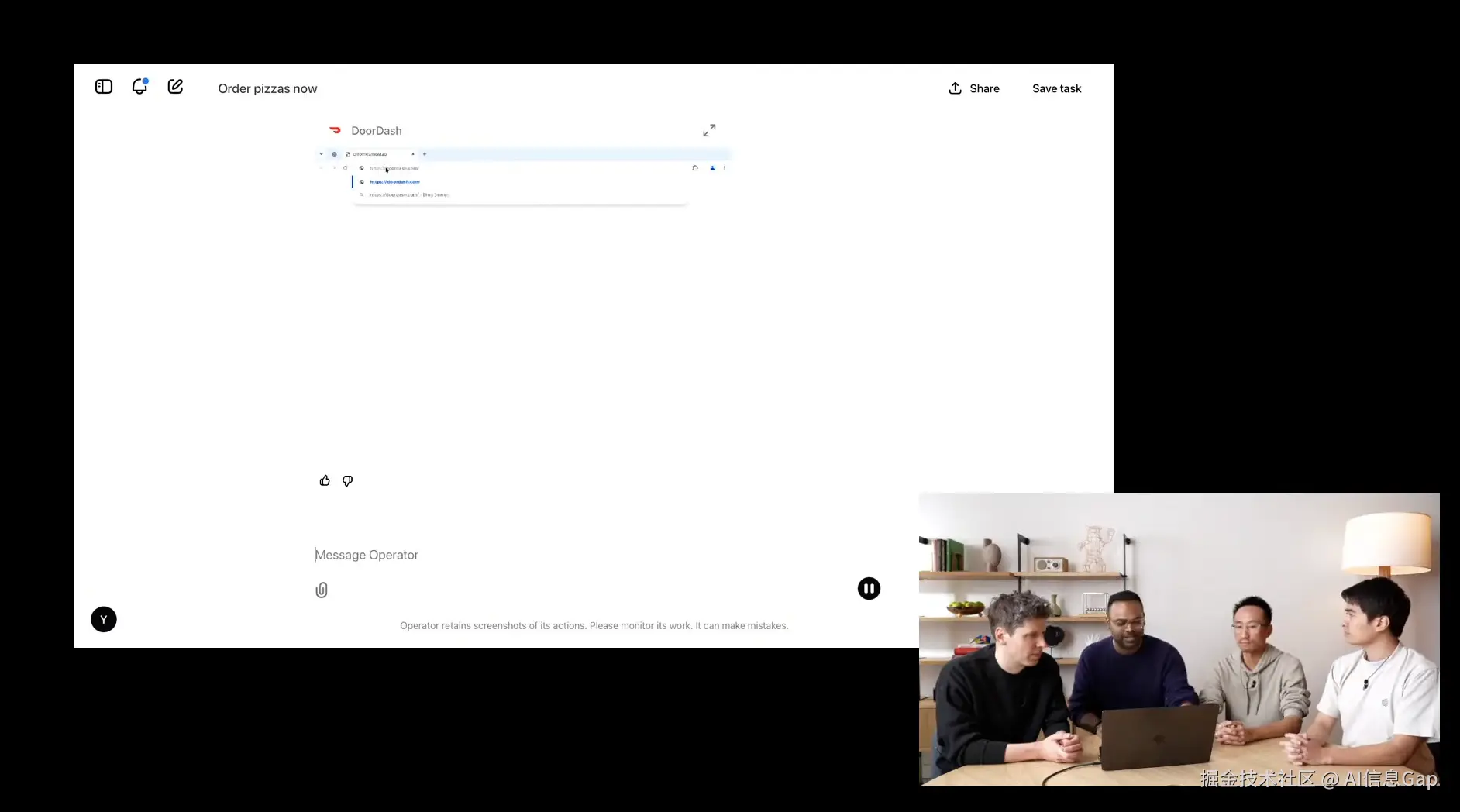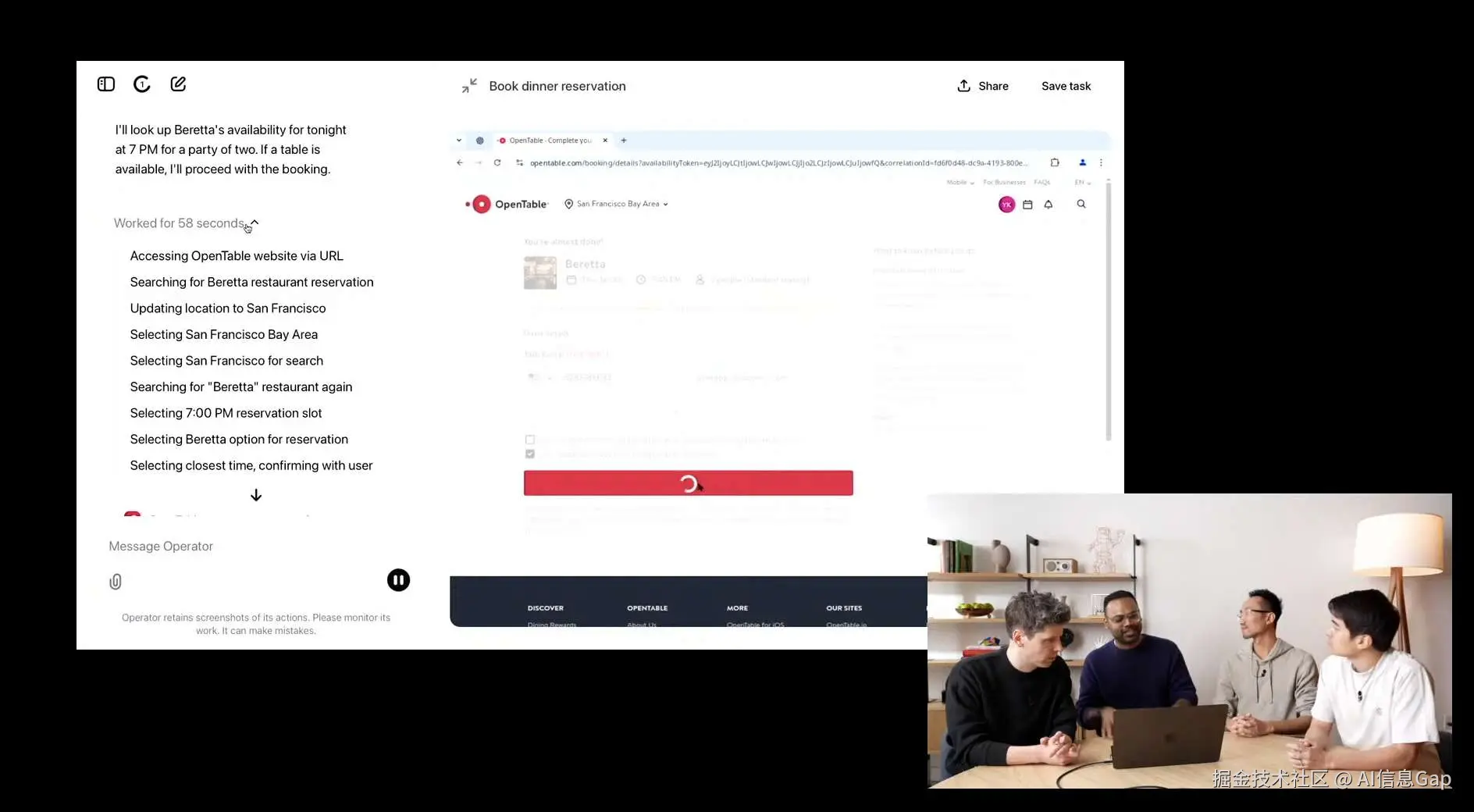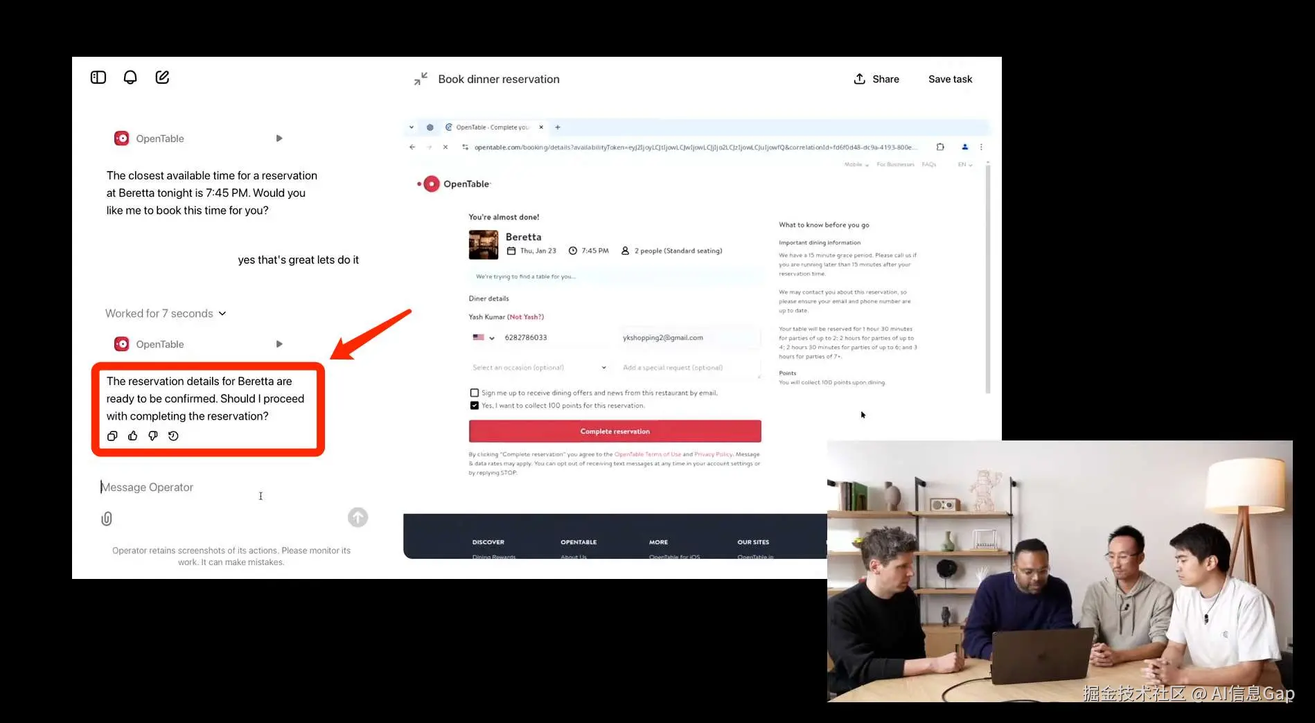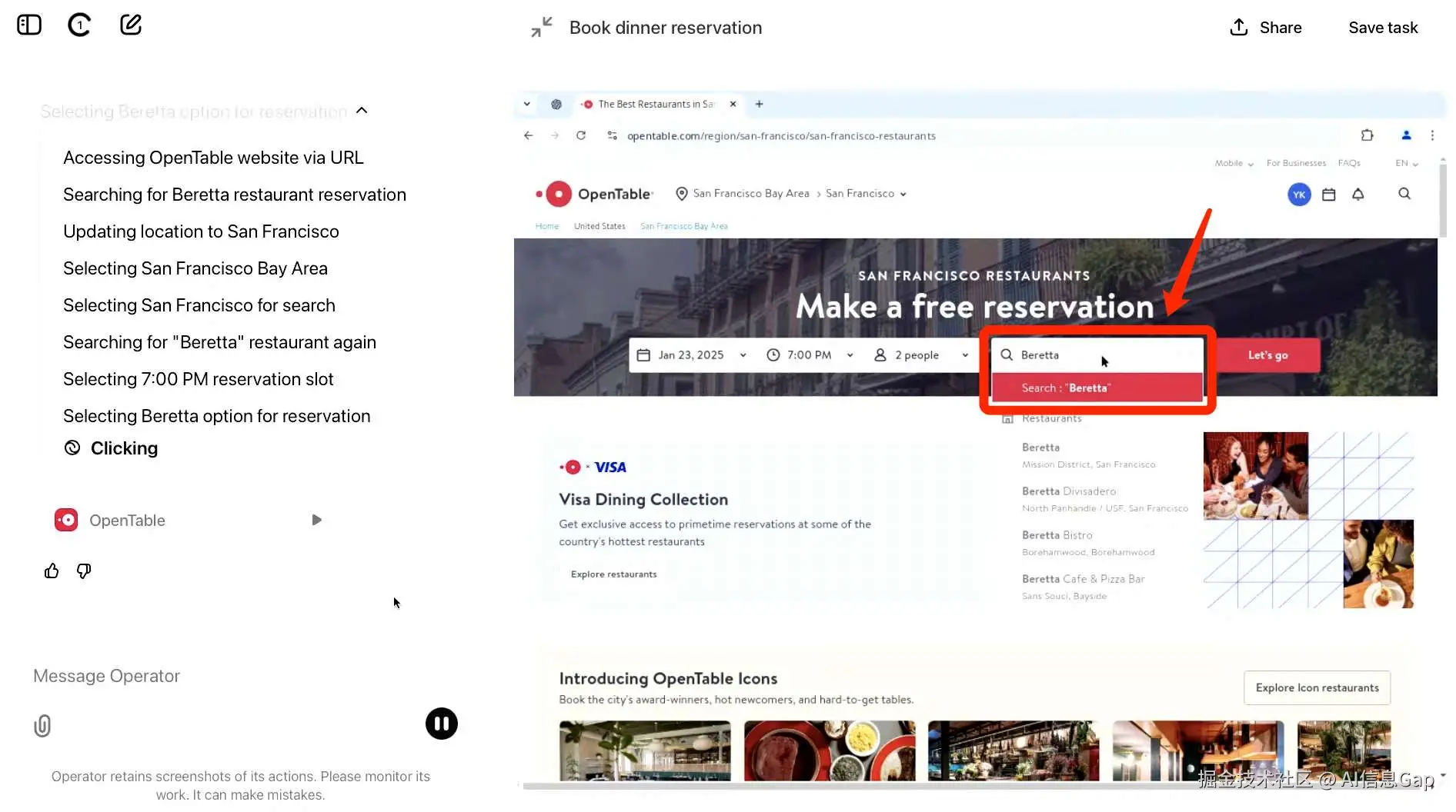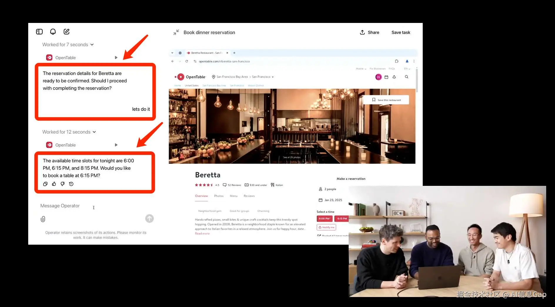 另外一点,Operator强调人机协作。Operator不是一个完全自主、不可控的黑盒,从上面的截图也可以看出,它在执行任务时会主动和你确认,尤其是重要操作,比如确认预定、付款。