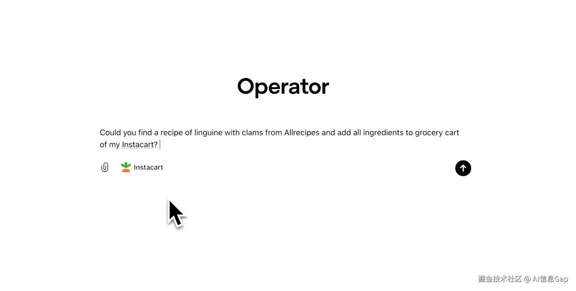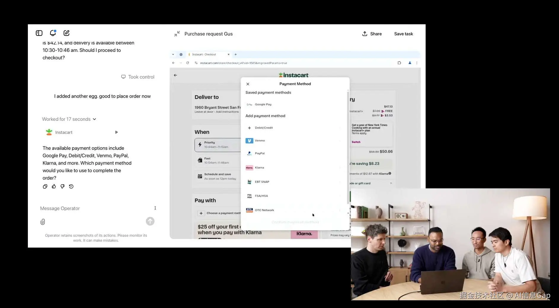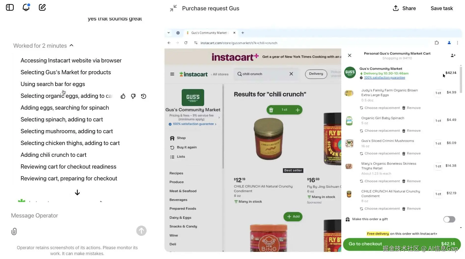 Operator能自动打开浏览器,进入Instacart(美国的叮咚买菜),选定相应的菜品,加入购物车。这一切操作当然都是由AI自动完成的。